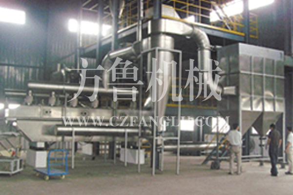 雞精有一定的粘性易粘在干燥機(jī)床面上造成干燥無(wú)法進(jìn)行。我公司為解決這一問(wèn)題采取了多種措施。雞精擠壓造粒成型后,表面水份較高,我公司生產(chǎn)的流化床第一段采取了低溫大風(fēng)量預(yù)干燥,使雞精表面水份迅速降低,同時(shí)表面粘度也有所降低。流化床第二段采取中溫大風(fēng)量干燥,以進(jìn)一步降低雞精表面水份。流化床第三段采取中溫常規(guī)風(fēng)量干燥,使雞精在流化床內(nèi)有充分的停留時(shí)間以得到有效的干燥。流化床第四段采取大風(fēng)量冷卻,便于雞精在篩粉后能直接包裝。總之,為了滿足雞精在不同階段的工藝要求,床面的開(kāi)孔率及開(kāi)孔方向以及風(fēng)機(jī)選型均有相應(yīng)的設(shè)計(jì)規(guī)范。