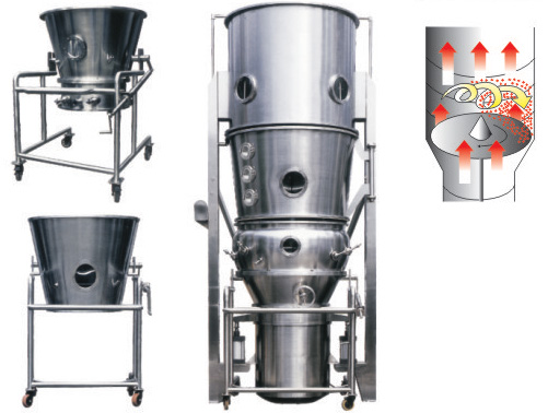 粉末或者母粒在旋轉流化床內,受到環隙空氣浮力,旋轉離心力,自身重力作用,呈環周繩股狀,粘合劑或包衣液噴入料層形成真球度極高的丸粒或連續均勻的衣膜。